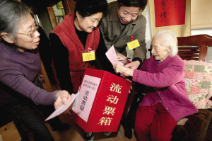 11月8日,在朝陽區水碓子東里團結湖街道第三選區選舉點,102歲高齡的徐奶奶通過工作人員送到家中的流動票箱,投出了自己莊嚴的一票。