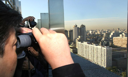 藍天中飄浮著白雲,遠處的西山清晰可見。記者昨天登上國際投資大廈22層樓頂看到,本市大氣透明度並沒有因為今冬採暖季的開始變得渾濁。為了確保實現全年65%的目標,副市長吉林昨天帶領市環保局、西城區區委區政府等有關負責人,一起登高查黑煙,檢查中沒有發現鍋爐冒黑煙的情況。
