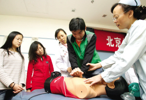 昨天,中日友好醫院急診科的醫生對北京化工大學50名奧運志願者進行專業急救培訓。